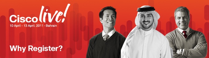 Why You Should Register for Cisco Live 2011, Bahrain Dear Valued Customer, Cisco Live 2011, Bahrain, is the leading industry event in the region specifically for IT and Communications professionals. In 2011, we are once again honored that the Kingdom of Bahrain will be hosting our event at the Bahrain International Circuit under the patronage of His Royal Highness Prince Salman bin Hamad Al-Khalifa, Crown Prince and Chairman of the Economic Development Board. By registering today for Cisco Live 2011, you will be able to… - Save $300 off the full conference price and be entered into a draw to win great prizes